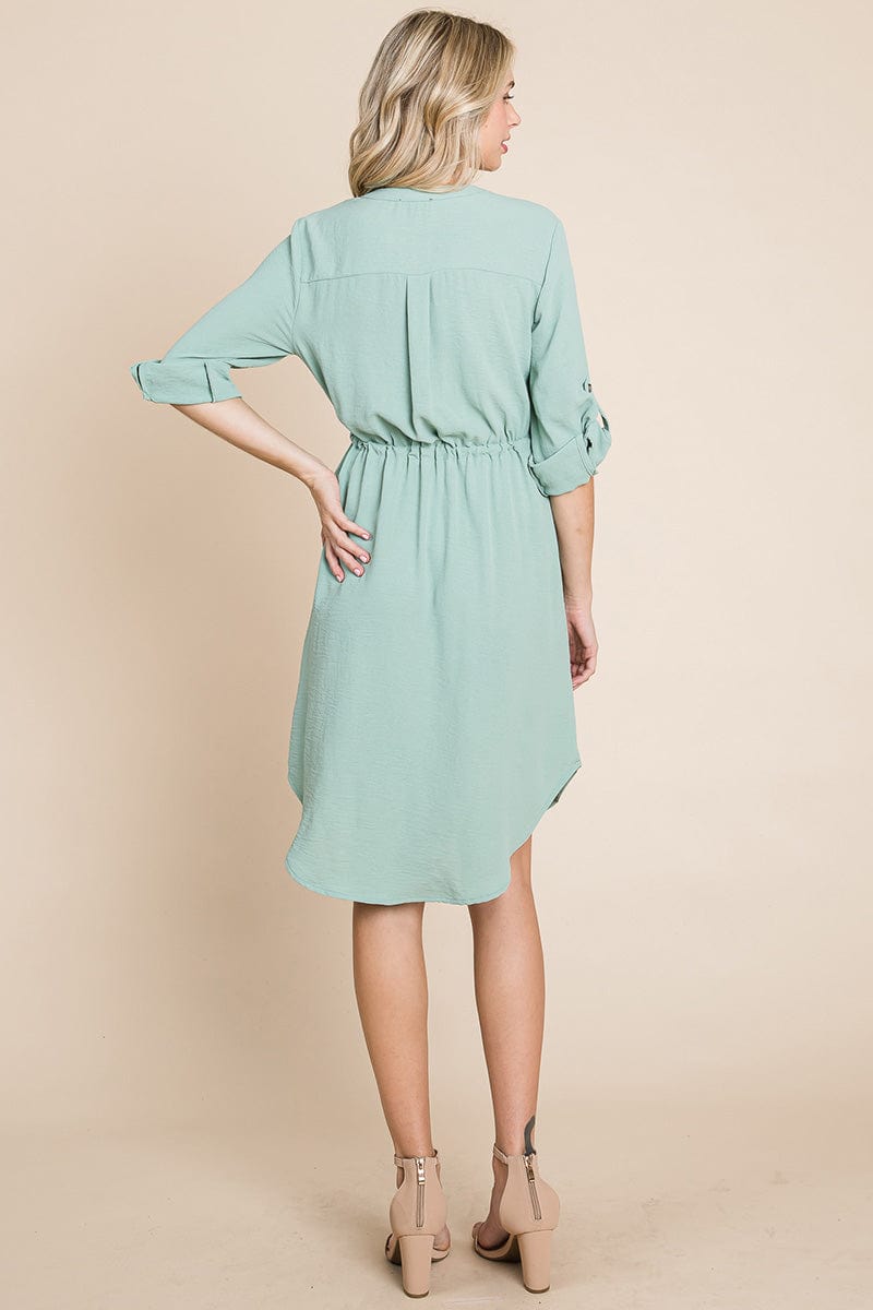 3/4 Sleeve Buttoned Waist Tie V Neck Shirt Dress