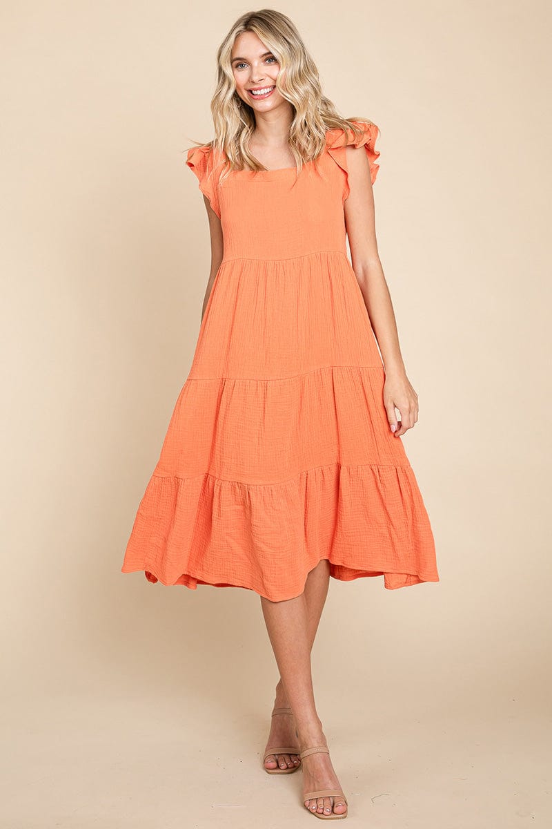 Features: Square Neck, Flutter Short Sleeve, Tiered, Layered, Soft Double Gauze Fabric, A line Dress, midi length